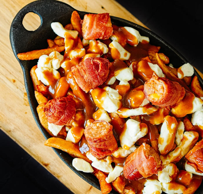 Frites maison, fromage frais du jour, sauce originale Courteau et délicieuses saucisses enrobées de bacon